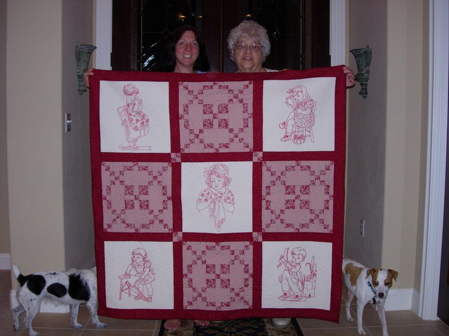| Design Source - Description | I taught my mother-in-law how to redwork and she liked it so much that she kept going. We had this idea to put the redworked blocks into a quilt. It was given to her granddaughter for her birthday. |