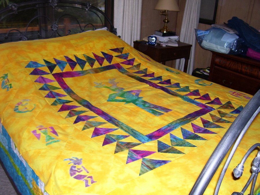 | Design Source - Description | Central machine appliqued figure of a shaman with "attitude", surrounded by flying Geese and framed on either side by southwestern motifs of thunderbirds, kokopelli, and geckos. Fabric used is flannel. |