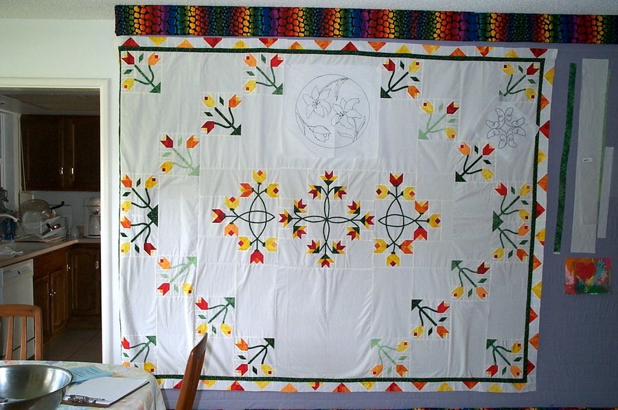 PattyinFlorida Grandma's Gift - I have my great-grandmothers wedding quilt; it is a Carolina Lily made in the 1870's. I was insipred by that quilt and by Carol Steiner's quilt 'Lilies are Forever' in the MAQS Founders collection. I made this quilt to honor my great-granddmother. The center medallion was hand-pieced using traditional techniques. The outer blocks were paper-peiced using contemporary techniques. The photo shows the quilt on my design wall with paper overlays showing some of the the quilting patterns I used. The was hand quilted by my mother and given to neighbor who is like a daughter so it continues the Grandmother's Gift legacy.