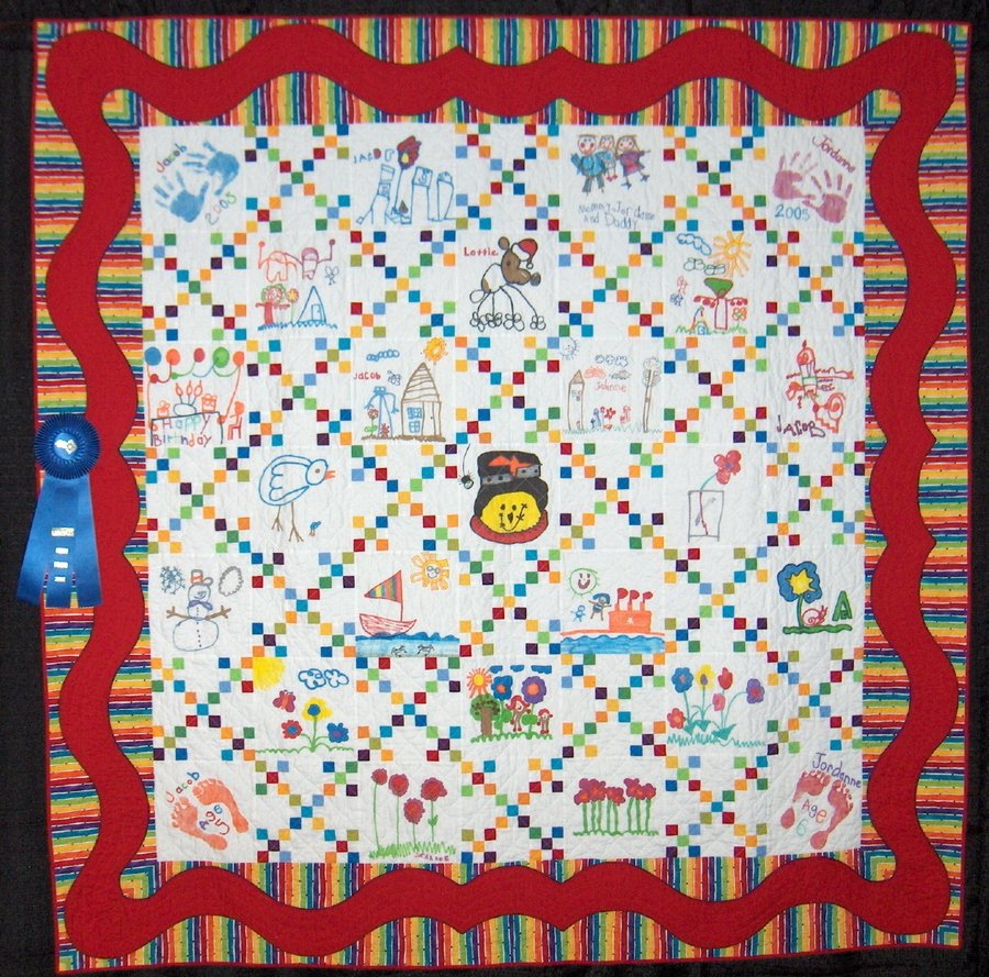 Margo Primarily Jordanne and Jacob - Our grandchildren's Original Artwork was scaled with computer to fit a 9" block. Designs were then traced using Fabric Ink, keeping the colors as close to their original art as was possible. The undulating red border has mini-piped edges. I made each child a quilt with their own artwork, but this combined one will stay at Gram's house! Won BEST CHILDREN'S QUILT at 2006 Smoky Mtn. Guild Show (Knoxville, TN)
