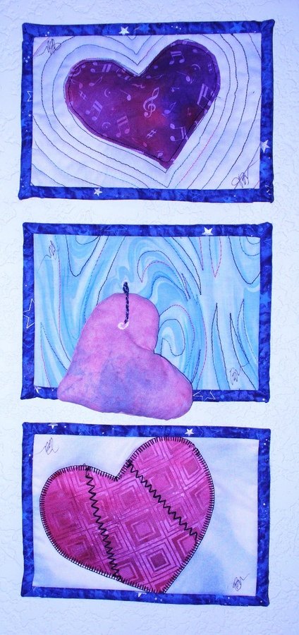 jbrown1265 Love-Yesterday, Today and Tomorrow - When first married, Love was fresh and new and innocent, now dealing with addiction & recovery of my beloved some days my heart hangs by a thread, and because Love endures all and never ends, but the healing leaves some scars. Made because Ricky challenged us to enter the MicroCosmos Show...the quilts were chosen for the show and on their way to LaVeta now!