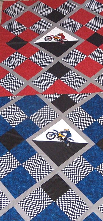 LauraLou Twin Motorcycles - After making the "Frogs" quilt for their mother, the twins wanted quits of their own. These are backed with Flames fabrics, blue and red, and quilted with a motorcycle panograph. Now Dad wants a quilt too --- of SNAKES!