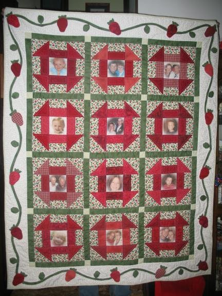 Bridget473 Grandma's Berry Patch - Made for my grandmother's birthday. It has photos of all of her children, grandchildren, and great-grandchildren in the centers of the block. My grandma loves the color red and strawberries, so I incorporated them into the design. She loved it!
