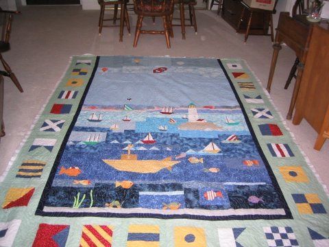 pennymom at the lake - This quilt was made for my sister, a lake sailor. Her name and mine are written in the alpha flags that make the border of the quilt. The size is for a queen bed.