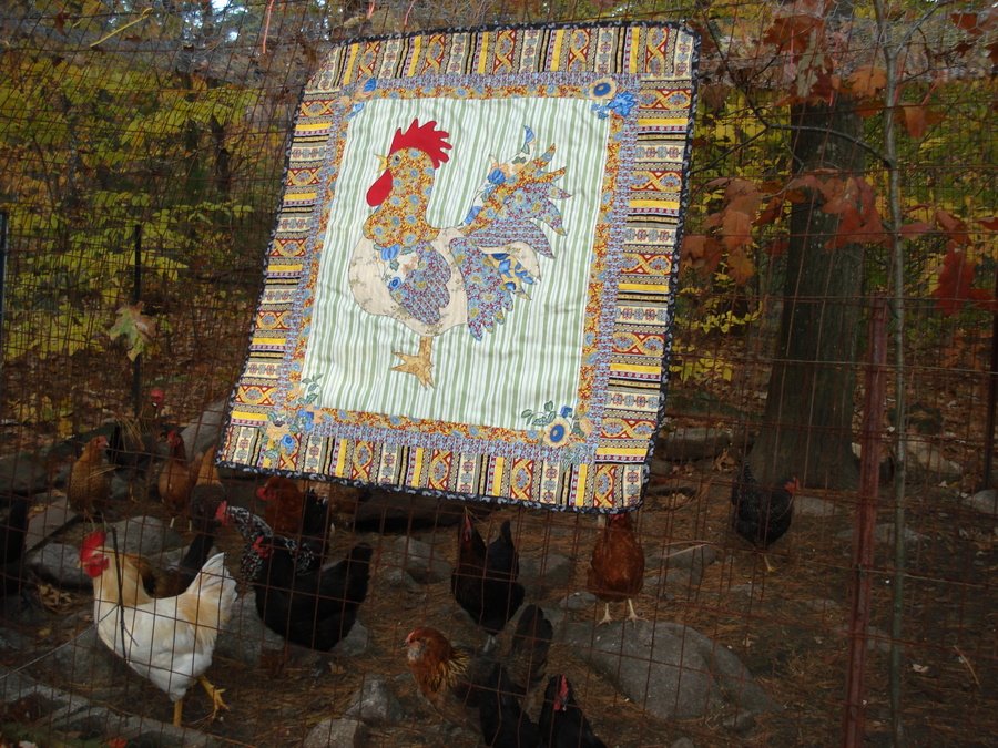 peggyanne The Funky Chicken - The Funky Chicken is a wonderful display of French Country prints and stripes! Suitable for a wall hanging, table topper or a fabulous chicken quilt on its own. (every chicken quilt is fabulous---who am I kidding...) $59 includes all fabrics for top PLUS backing, and pattern. www.peggyannes.com (603) 223-2344