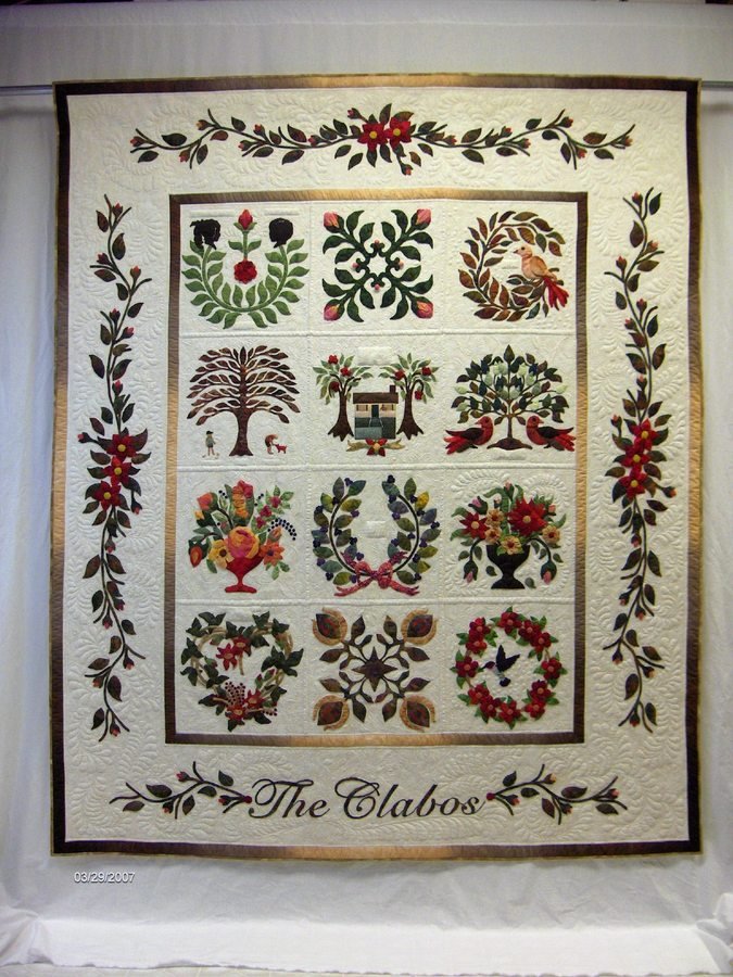 Margo The Anniversary Quilt - "The Anniversary Quilt" commemorates our 40th! It is needle turned applique by me, and expertly machine quilted by Kathy Drew. It was juried into the 2008 AQS Expo in Nashville, and is featured in the 2010 Quilt Art Calendar. There are pictures of the individual blocks on my Webshots web page.