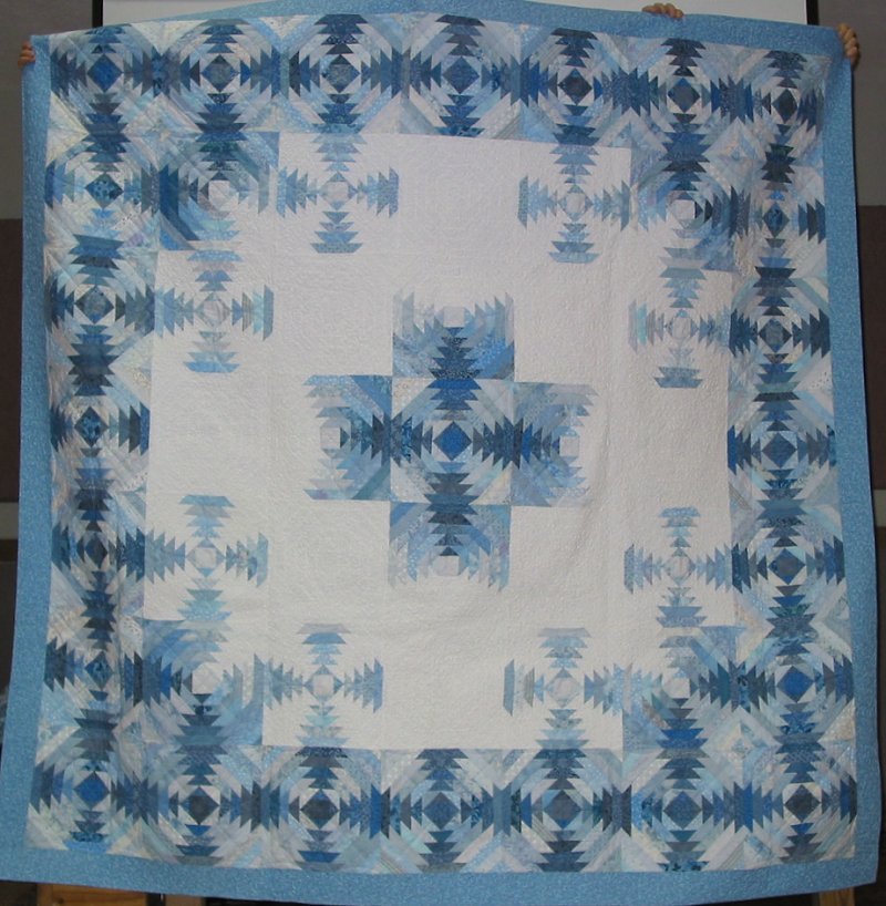 QMJudy Anniversary Quilt - This was made for my in-laws' 50th wedding anniversary. It's a variation of Pina Colorada, which is a variation of Reflections, by Shelly Burge. I got pretty tired of blues and white; I prefer wilder colors. But they seem to like it.