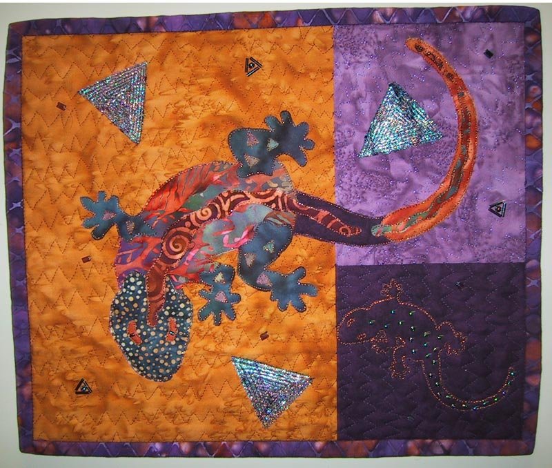| Design Source - Description | Fabric collage based on a Gecko collage in Susan Carlson's Freestyle Quilts book, and added my own embellishments of Angelina fiber, beads, metallic threads, and free-motion quilting. |