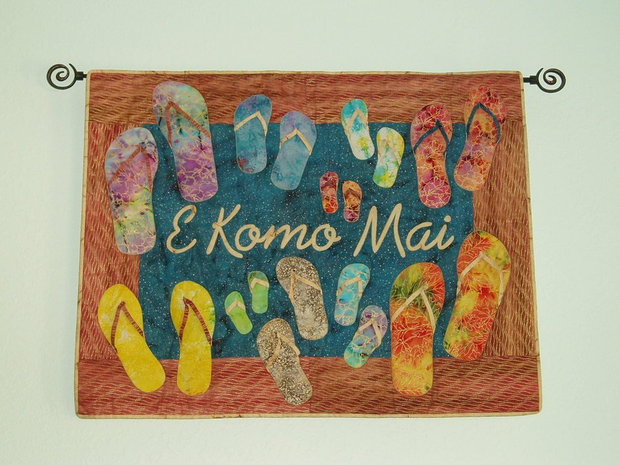 mskazooli Wecome - On a recent trip to Hawaii I found this pattern in a small quilt fabric store and had to have it. It hangs in our new home. The flip-flops are actual tracings of my family's feet. It was machine appliqued and machine quilted.