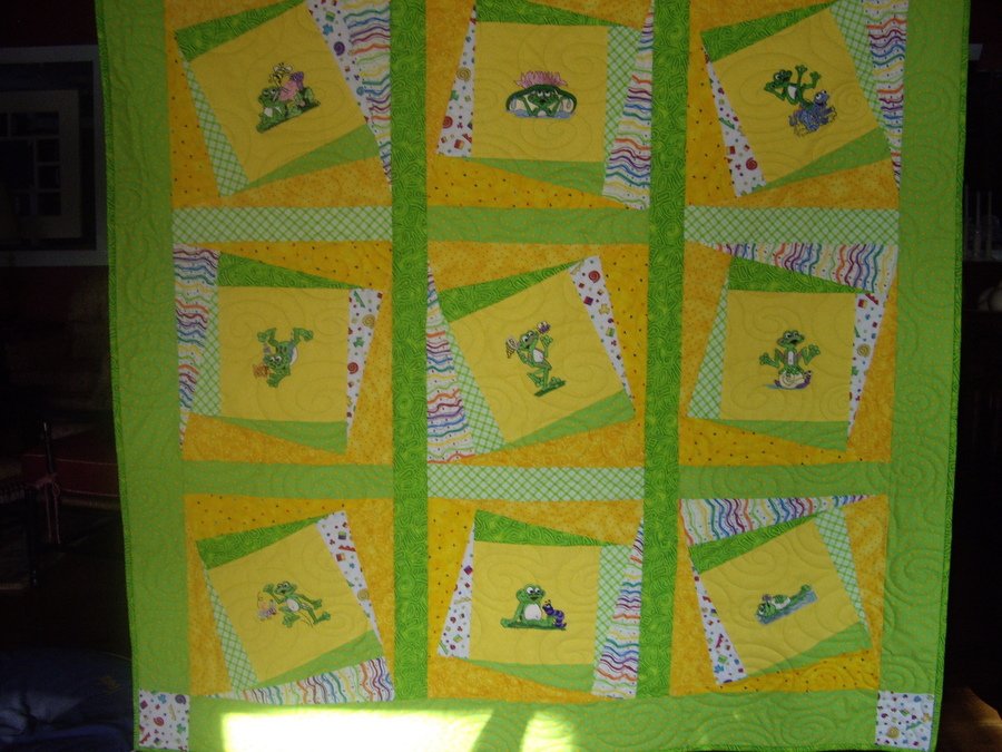 | Design Source - Description | Quilt was made for my neice's new baby boy, Dylln Michael. The center blocks were embroidered with the frogs from Dakota, then I used the Twist and Turn pattern by Sharyn Craig. |