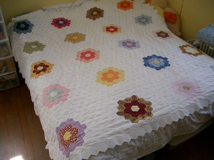 | Design Source - Description | I am still working on this quilt and have no idea how to finish with the border... also have no clue when it will be finished. It`s all hand pieced with plastic hexagons inside. Anyone with any suggestions? :) |