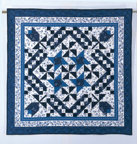 KEINMO ICE Train to Amsterdam - This quilt is made entirely of Dutch Reproduction fabrics from Den Haan and Wagenmakers, Amsterdam the Netherlands. It is comprised of three simple, nine patch blocks. When the blocks are set together, a dramatic overall design emerges. I think it captures the look of Delft blue china perfectly.
