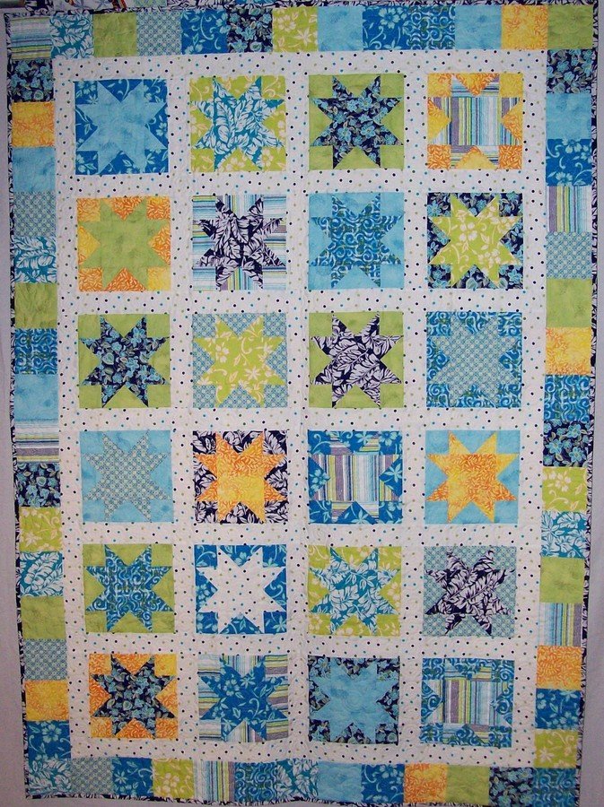 KEINMO Summer Daze - I made this quilt using a new tool I designed, the Easy Star and Geese Ruler, which is just being manufacured and launched by EZ Wrights. The fabrics are by RJR -- the Summer Daze line. This quilt was loads of fun to make, and with the ruler, there is no math needed to make the flying geese and no fabric waste!