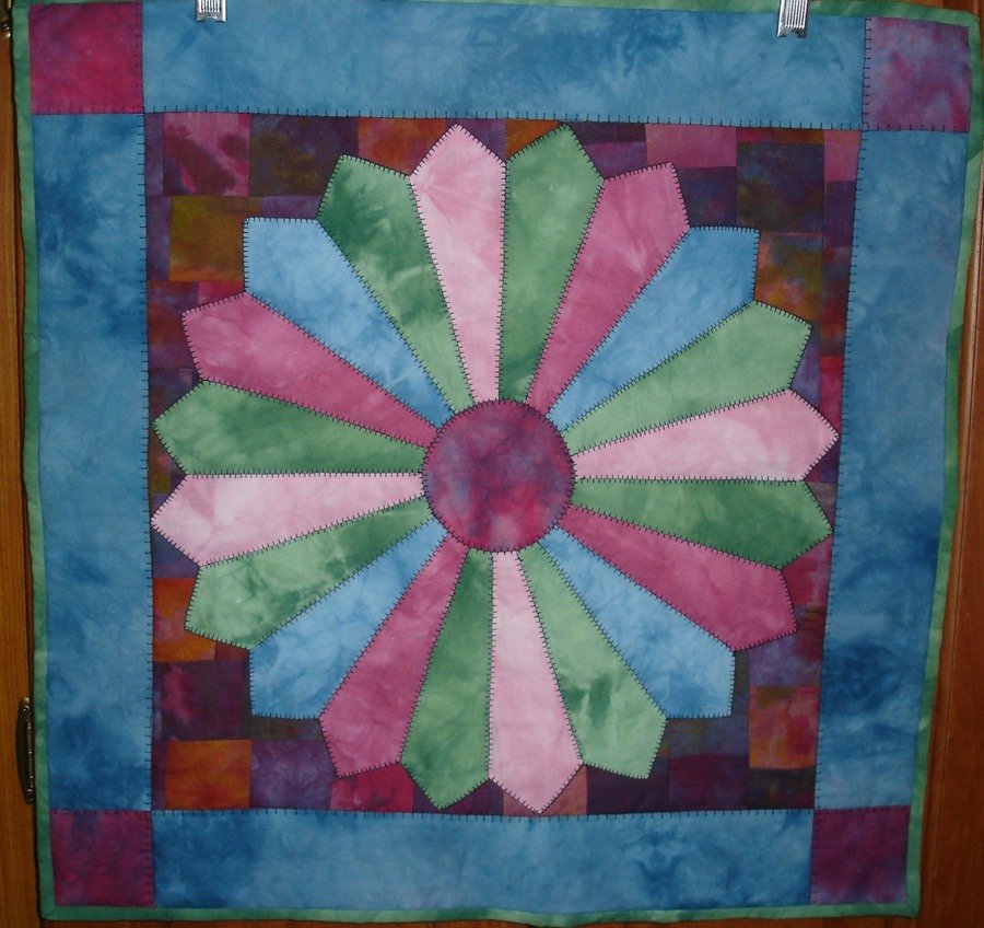 Donakay Hand Dyed Dresden - My first creation using my hand-dyed fabric. Due to the somewhat rough quality of the fabric makes the blue borders look like swede. Some fabric was less than lovely so I over-dyed it, cut and resewed it to a somewhat crazy-quilt background.