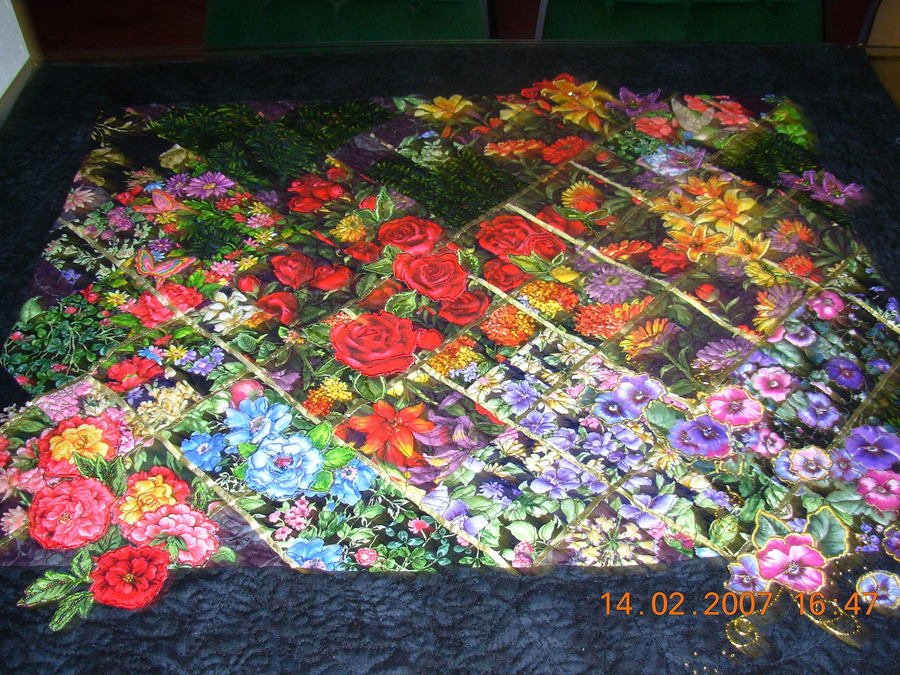 | Design Source - Description | Guild challenge to use fabric with roses and irises. Blocks placed on point, gold lattice work Applique loose flowers on top, beaded details |