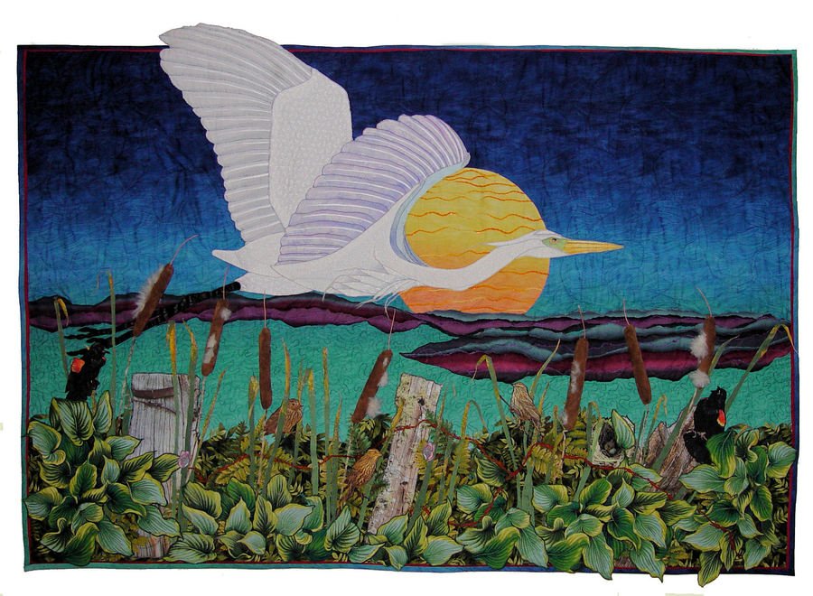 | Design Source - Description | 4x6 foot wall hanging with egret and blackbirds. 3-D cattails and barbed wire. Appliqued fence posts and plants. |