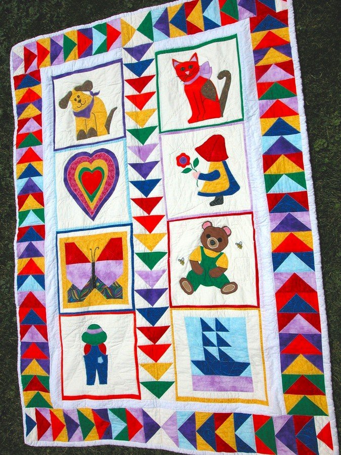 vampyrmom Child's Primary Quilt - The built is made in primary colors of the rainbow. There are 8 blocks consisting of Sunbonnet Sue, a multilayered heart, a dog, a cat, a boat, butterfly, bear, and suspender Sam. The back is white chennile type fabric. It was machine appliqued. The patterns I found in various pattern books which I embellished on.
