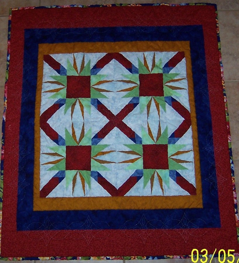 ShariK Michigan Star - Quilt designed for my Mother to use when she is in her wheel chair. Borders were made uneven to get the size I wanted. Border quilt designs were done with my embroidery machine. Center was done with quilt-in-the-ditch around the stars, with a star motif in the center.