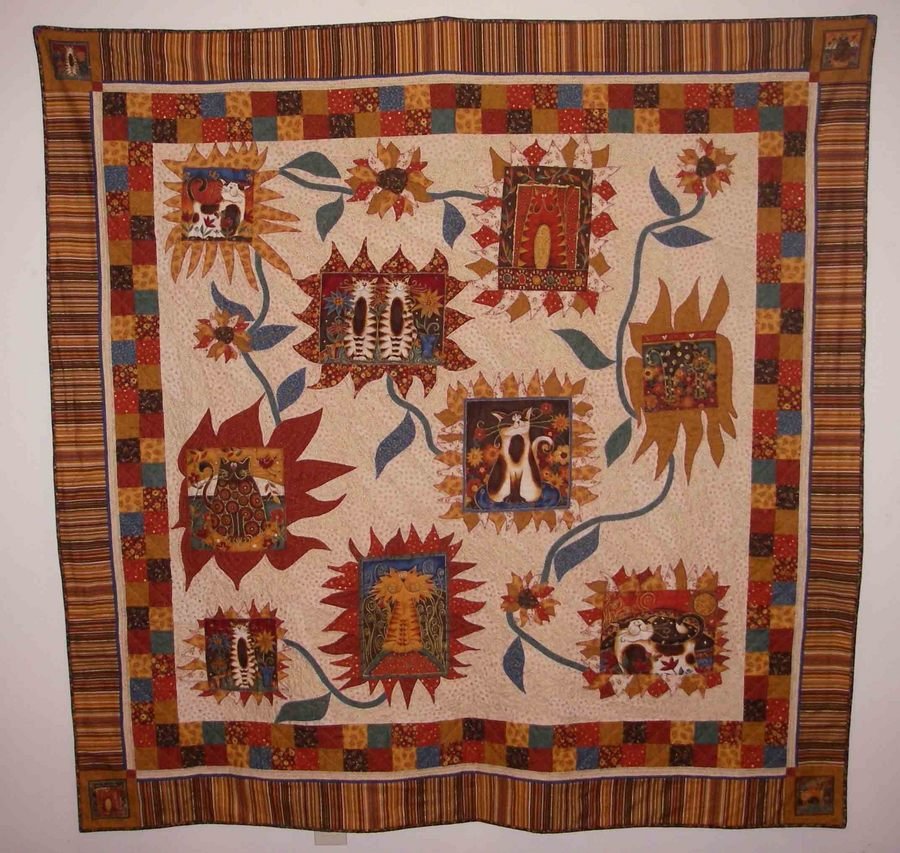 | Design Source - Description | I used Andovers Fancy Cat printed panels to frame with applique sunflower petals, the background is two different fabrics with lines radiating from the corners, (very subtle) |