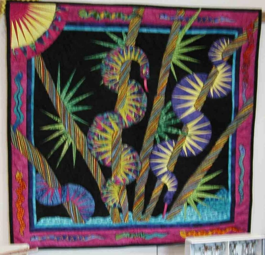 katiedid Yikes - This was made for the Hoffman chalenge. It was chosen to travel in one of the Trunk shows, it is currently touring the country. It was designed around a beauty block design, as I was sketching the bamboo leaves, the snakes just kind of appeared out of nowhere. Sorry about the quality of the picture, I will take a better one when the quilt gets home from touring.