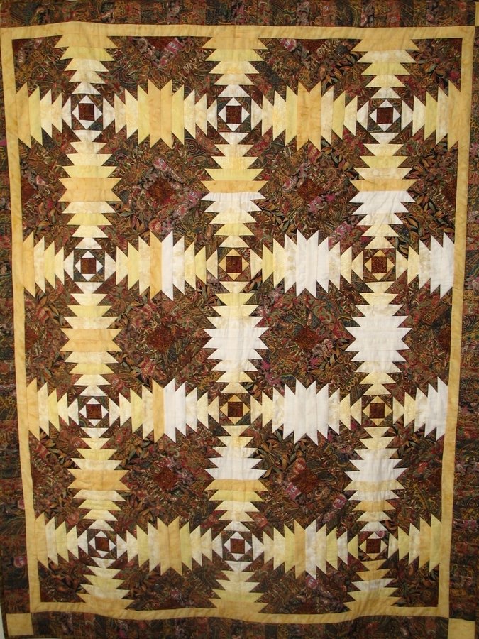 DebbieD Kashmiri Pineapples - This quilt was inspired by the Hoffman "Kashmir" collection, and I was most interested in have the "circles" show in the design. this was my first pineapple quilt, but certainly won't be my last! A paisley is quilted in each dark area.