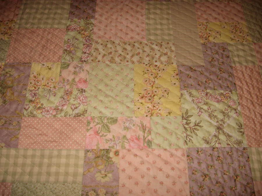 Sherrym Romance - I made this from the very popular Yellow Brick Road pattern. Again, as a member of my small church group, we all made the same pattern using individual fabric choices. I love the soft romantic feel of the floral prints. This is currently on my frame being hand quilted in a crosshatch pattern in the large central area. Will probably do something viney on the inner border and maybe feathers on the outer.