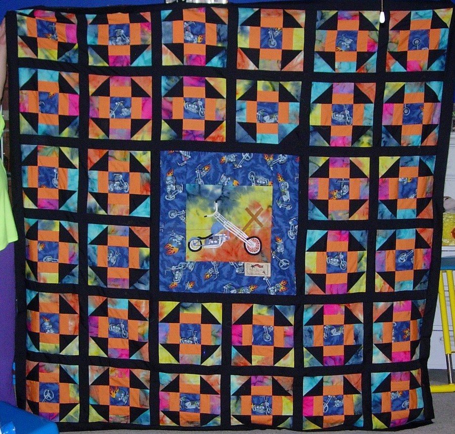 | Design Source - Description | This is a raffle quilt for the Sons of Thunder Motorcycle Ministry group that my mother is a part of. It will be raffled off to raise funds for the Blue Santa Program. The center is hand embroidered. |