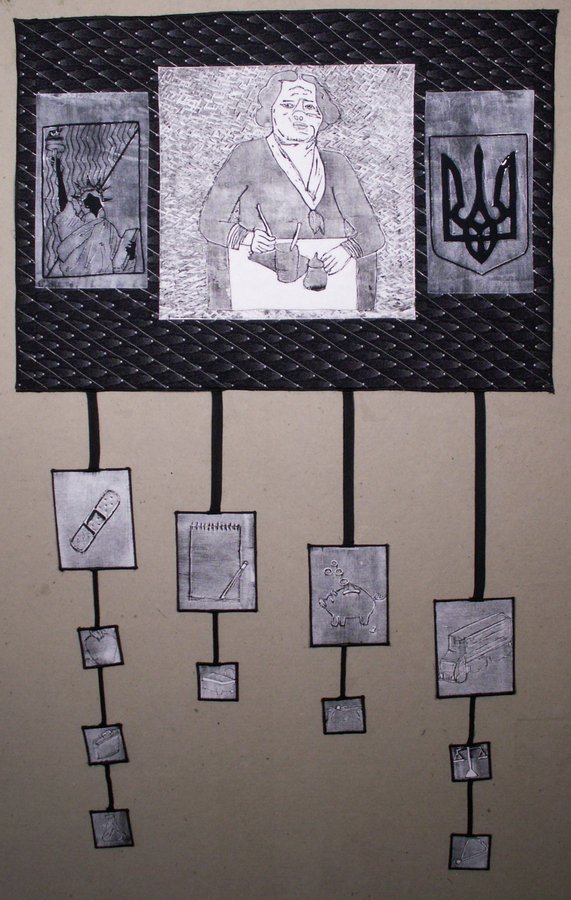 jeriptoo Julia Krichkowski: An Immigrant's Journey - The top panel depicts the first time she wrote her name, along with the symbol of her native land the Ukraine. The icons depict her children and grandchildren. This quilt is part of the She Made Her Mark Exhibition at the Quilter's Hall of Fame in Marion IN. It was made especially for this exhibit.