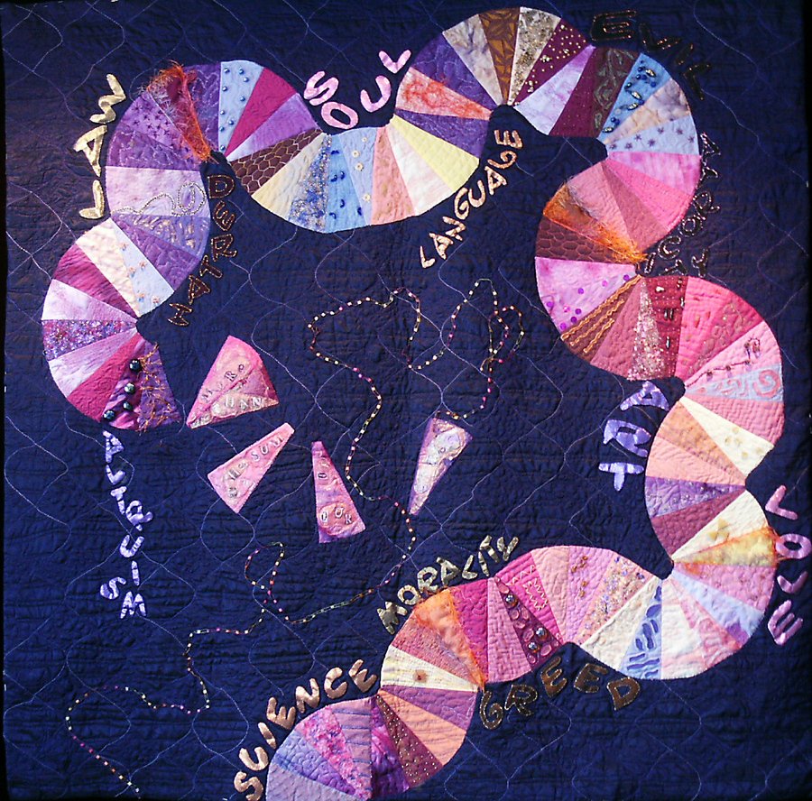 jeriptoo More Than the Sum of Our Genes - Made in celebration of the completion of the Human Genome Project, the complete mapping of human DNA. While celebrating the accomplishment, this piece addresses the idea of what makes us human. Background quilting depicts DNA.
