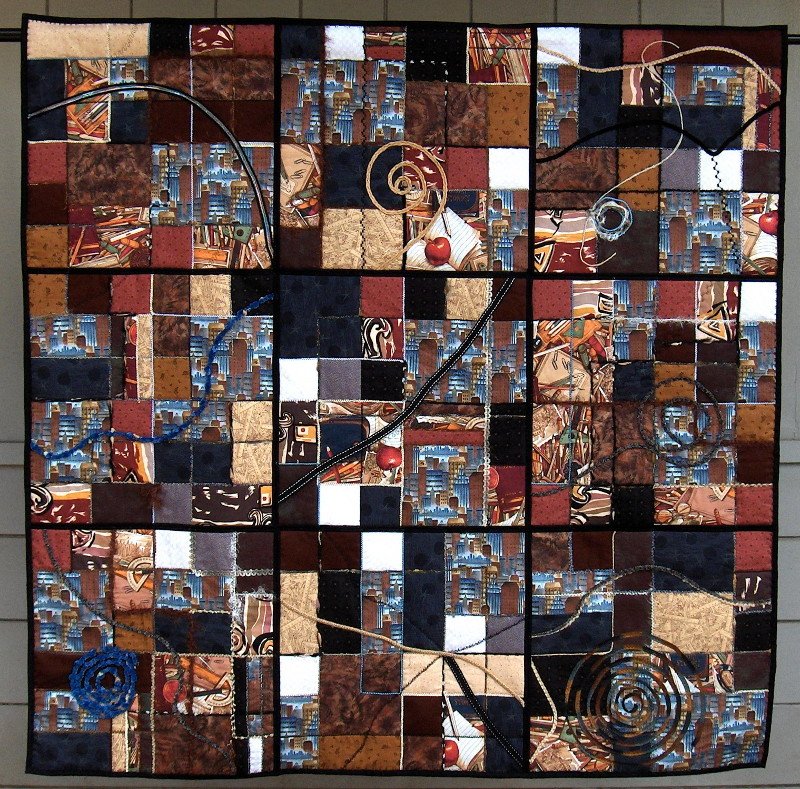 RAQuilts Cityscape - I started to make a YBR quilt, and didn't like what was happening. I put the blocks into groups of four, embellished and quilted them, serged the edges, then zig-zagged the bigger units together, and embellished again. Then I liked what I saw! There are even pennies glued to the quilt because one often sees them on the ground in the city.
