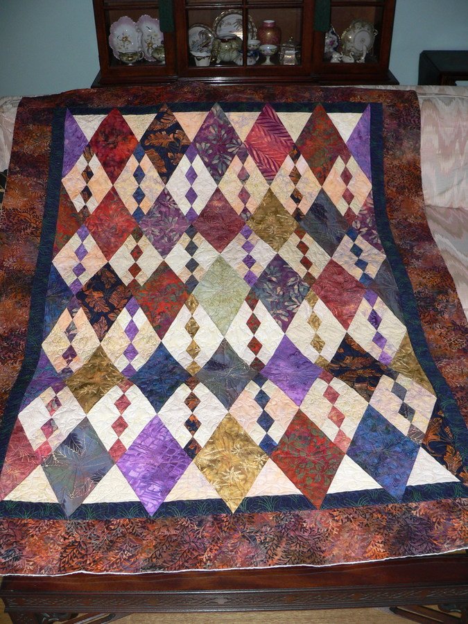 johnthequilter Diamonds in the Rough 2 - I was looking for a quilt to make for a relative as a "Wear Me Out" quilt. The magazine arrived the day I started looking. It reminded me of argyle and I thought it would be a good "guy" quilt. I made the first one and presented it within 5 days of receiving the magazine. Marvin was undergoing bladder cancer surgery and the quilt needed to be done quickly. It's good to own your own longarm. I liked the quilt so much that I made a second one for myself.
