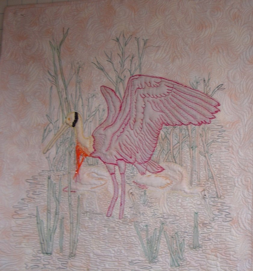 EveningStar Rosie Spoonbill and her Babies - Shadow Trapunto: This provided me with the perfect opportunity to try out some new techniques I had been playing with for some time! The shadows are vibrant ONLY when WET!