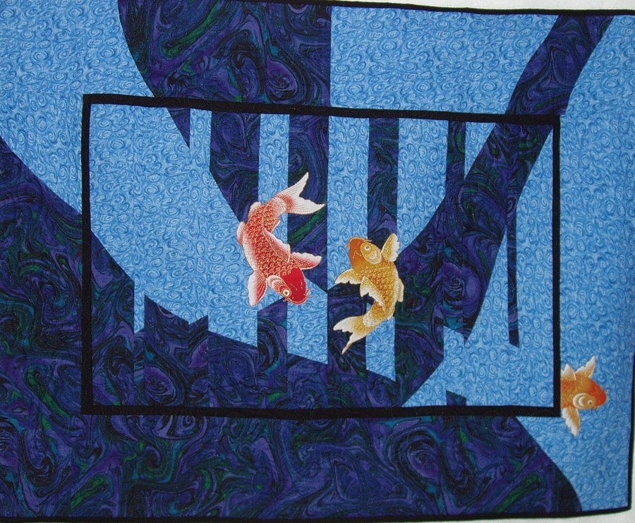 angelinejovan Fish Tales - 3 koi machine appliqued onto convergence background. Made for my father's 80th birthday. He has always been drawn by the ocean, so the convergence in blue calls to mind the ocean. He is a fisherman, from salmon troller to aluminum boat as while as a Pisces. The two koi are circling in the Pisces symbol. And the little one in the corner? He's the "one that got away"! The fish are raw edged machine appliqued. Each scale is machine quilted as well as the facial expressions - as far as a fish can have expressions... Background quilting is a continuous circular wave pattern. Idenitifactio as well as dedication is on pocket in back. Inside the pocket is a printed description, dedication, care instructions and signature.