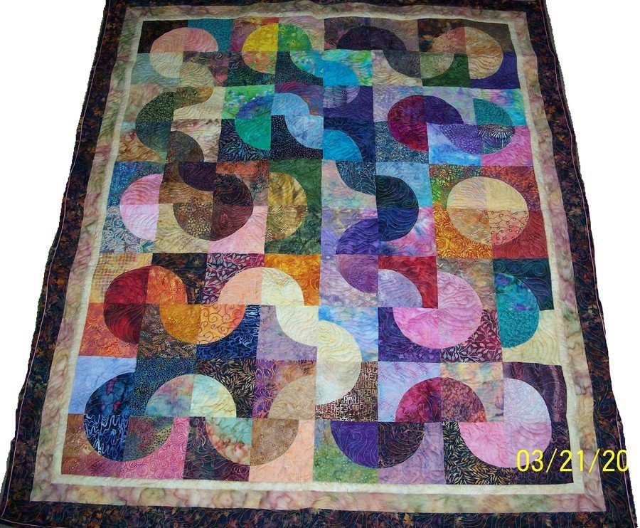 caraolson Drunk In Bali - I love Batiks and I wanted a pattern where I could use as many as possible in one quilt. This seemed to be the answer. It was my first attempt at sewing curves, and after as many as there are in this quilt, I came up with the name of my quilt... after a few glasses of wine!!