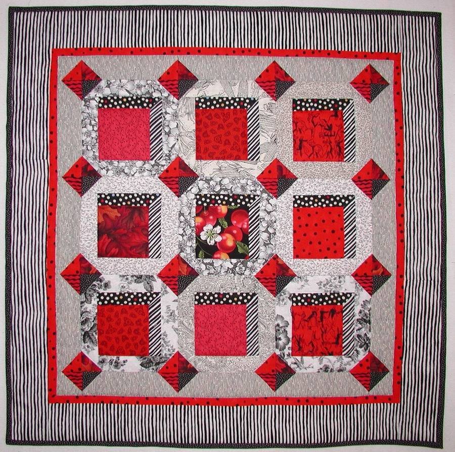 JudyPete Bunbury Red - In 2005 my online quilting buddy in Ohio urged me to join a quilt challenge in Australia entitled "Colour My World". The challenge fabrics were the black/whites. I didn't want to purchase more fabs, so dug into my stash of reds to create these attic window blocks. The design is my own. Size is approximately 26 inches square.