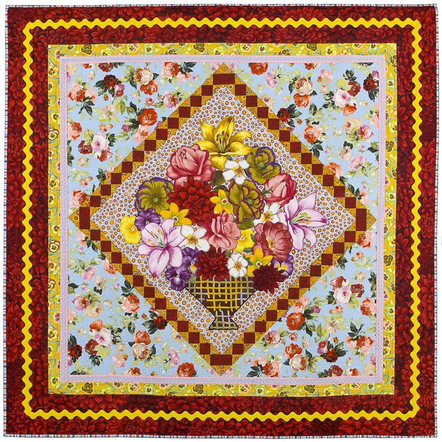 | Design Source - Description | A unique floral bouquet quilt using non-fused collage techniques, machine blanket-stitch appliqué, and free-motion embroidery. Embellished with rickrack, beads, rhinestones, & embroidered bugs. |