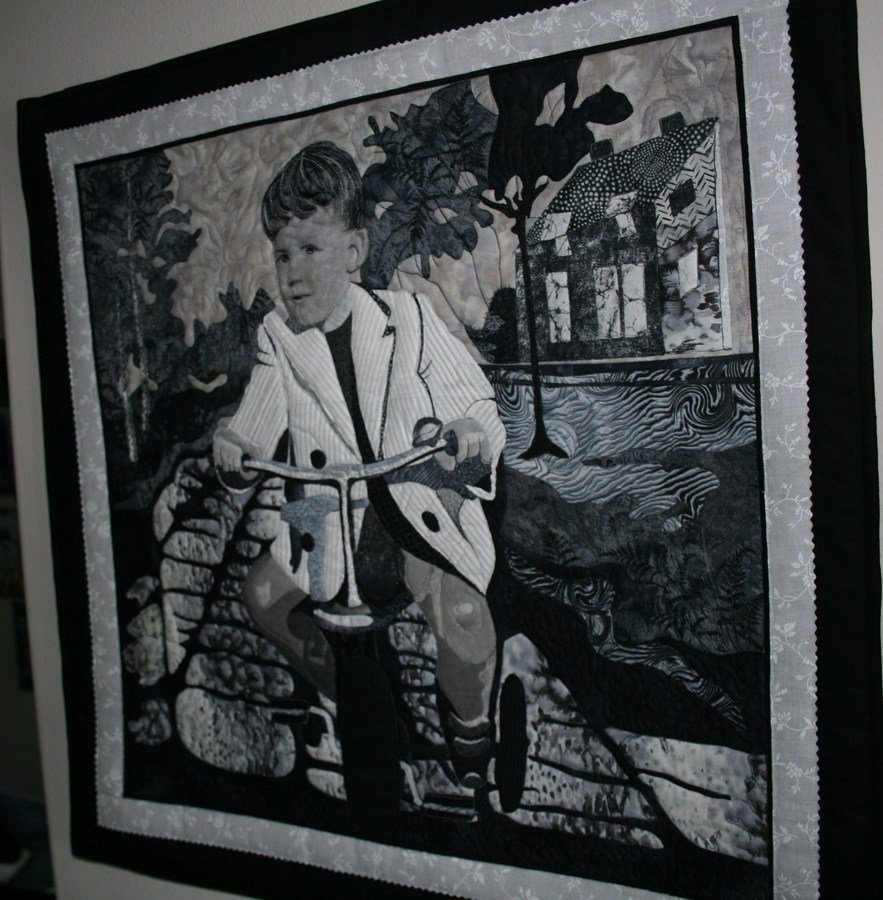 MarietNieskens When I was a young boy - This is my husband when he was 3 years old on his tricycle. I designed pieced and quilted the quilt It is his birthday present.