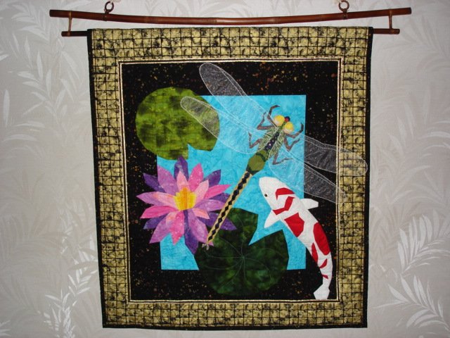 smurphy Susan Murphy - Paper pieced wall hanging (with designer quilt hanger) based upon the pattern "Dragonfly Pond" by Stephen Seifert donated to the 2007 Central Florida koi club show & sale. Purchased at auction by a private collector from Orlando.