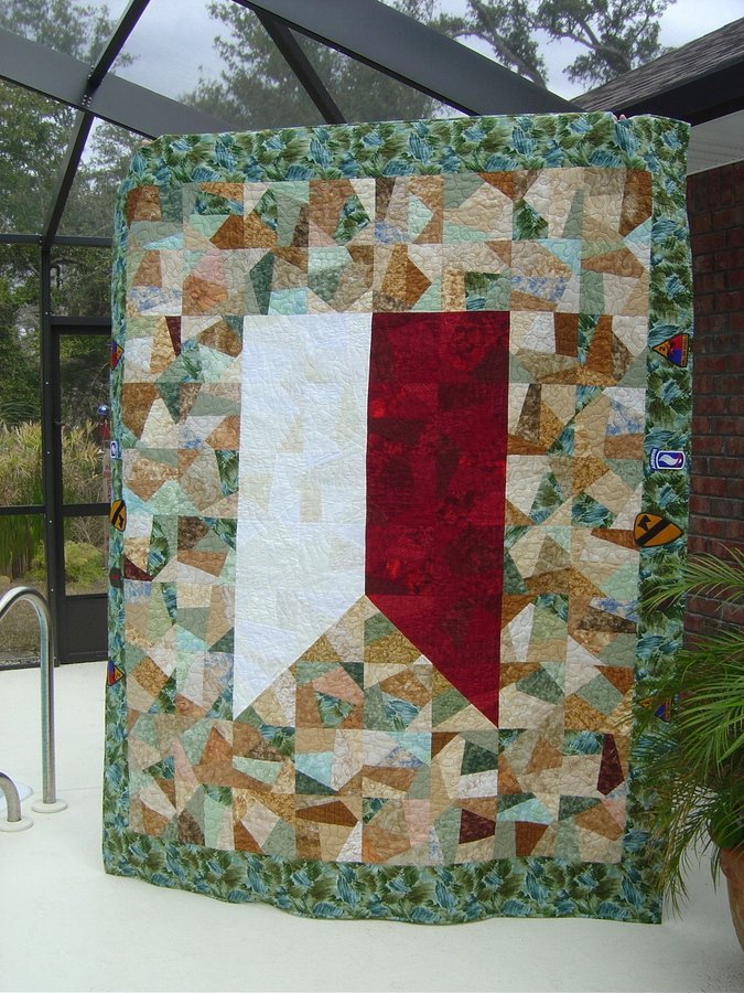 annasgirl Bryan's Cavalry Flag - This quilt was made with the wonderful Stack the Deck technique and my own original pattern for the US Army's cavalry flag. The background was made to resemble camouflage fabric and has Bryan's Army patches sewn on the borders.