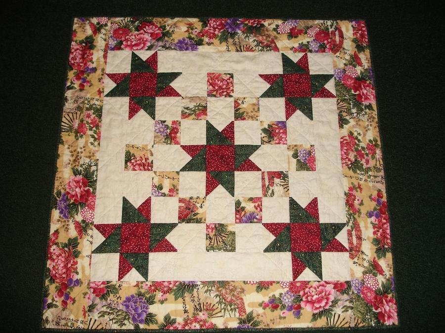 Quilterwithhearts Ohayo Stars - First quilt with triangles. Won second place in the beginner category in the Pacific Patchwork Guild's Winter challenge. Christmas colors combined with an Asian theme! Ohayo pronounced the same as Ohio(for the Ohio star block) means good morning in Japanese.