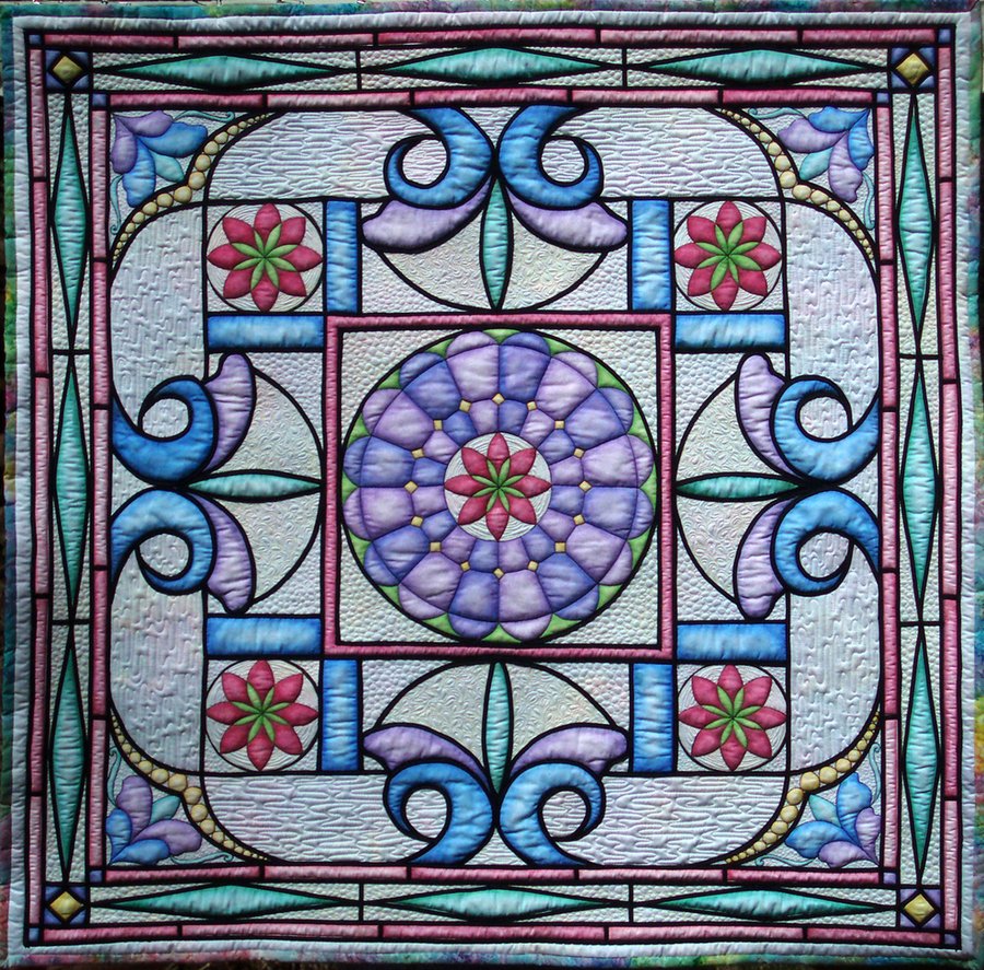 CabinQuilter Shades of Tiffany - Shades of Tiffany is a 34" x 34x' shadow faux trapunto wholecloth quilt. The binding is made from the same batik fabric that was used under the cotton sateen top. It shows through very subtly until you hold it up to the light. The background fillers were stitched with either white or pale yellow thread, to replicate the different types of glass used in stained glass windows. Two layers of batting were used to enhance the faux trapunto look: Hobbs 80/20 and Quilter's Dream Deluxe Poly. Color was added with Prismacolor pencils and textile medium.
