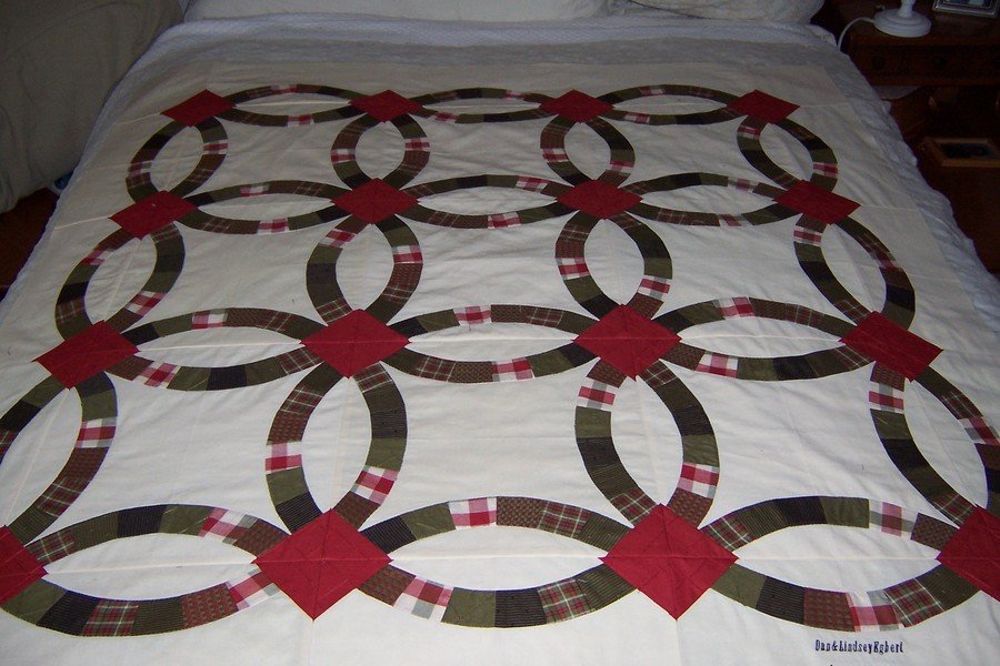 Poobear1929 Happy Anniversary - This was my first real quilt I ever made. I made this quilt as a gift for my best friend's wedding anniversary. I made this quilt shortly after Christmas; my husband bought me a new sewing machine. I bought the book Egg Money Quilts and fell in love with the double wedding ring pattern. It was quite a journey to put it all together. I even attempted to use my embroidery attachment on my sewing machine to embroidery my friends name and date of their wedding. It took me about four months to make and it measures 46x46 inches. I did the quilting myself, even attempting free motion patterns in the corners of the quilt.