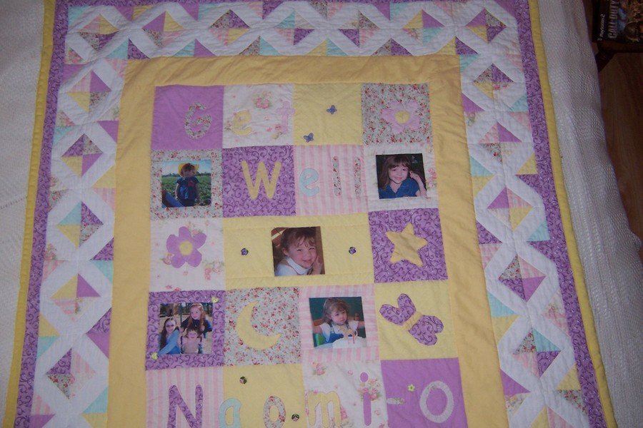 Poobear1929 Get Well Naomi-O - This was my fourth quilt; I made this for my neighbor’s daughter who has cancer. I wanted make something to cheer her up. I also had her older sisters help with the design and color scheme. I printed the pictures on special fabric, boy that stuff is so cool. The appliqué images were drawn on freezer paper by Naomi’s sister and I machine appliquéd them on. I gave Naomi a special marking pen for fabric, so she can have all her friends, family, and doctors write special get well messages on the quilt.