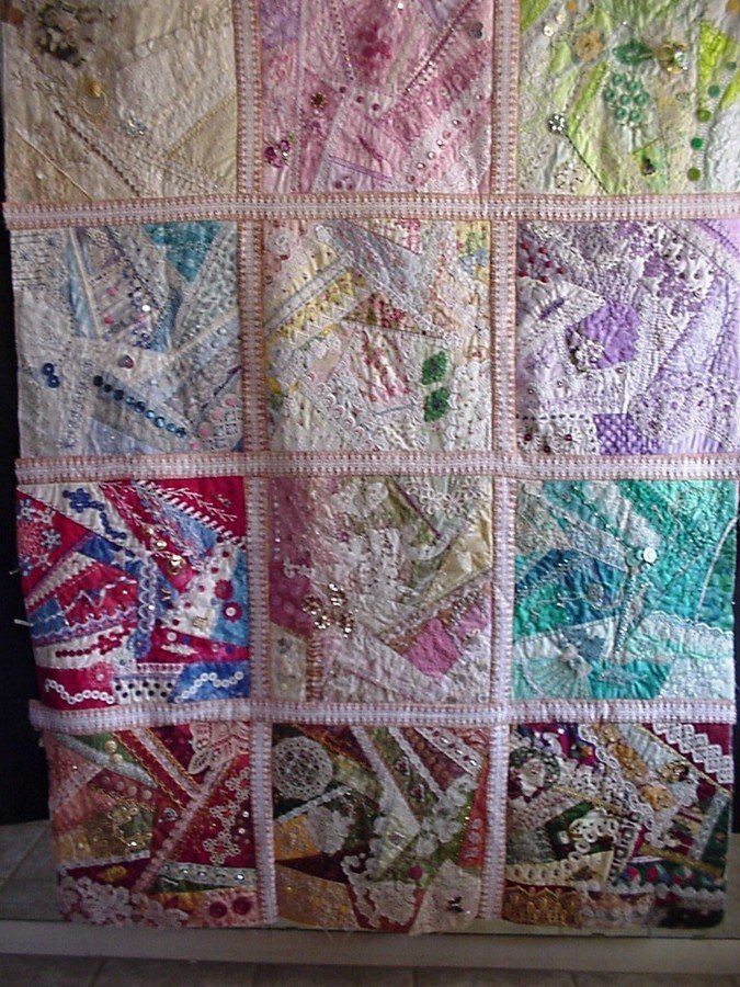 DeanDeer Crazy Quilt from block of the month class - This Crazy Quilt is constructed using my technique. You sew one time, and that is when you embellish your seams. I cleaned out my button jar on this quilt. Blocks are 16" and sashing is 2" I made a crazy quilt from one of my daughters wedding dresses. It was difficult to insert lace and trim with the seams already sewn. I did not like sewing it on top and ripping to tuck ends in. I designed a technique for block construction that allows you to insert lace and trim under an unsewn seam. It is better for me, to have a finished block first, then decide where I want lace. Once you decide what and where you want you trims to be place, then you sew one time and the seam and the trim is all done in one step. I love this technique and so do my students. The method can be used on clothing also. I do sell this pattern and my patterns are published by me under Dean Deerfield Designs.