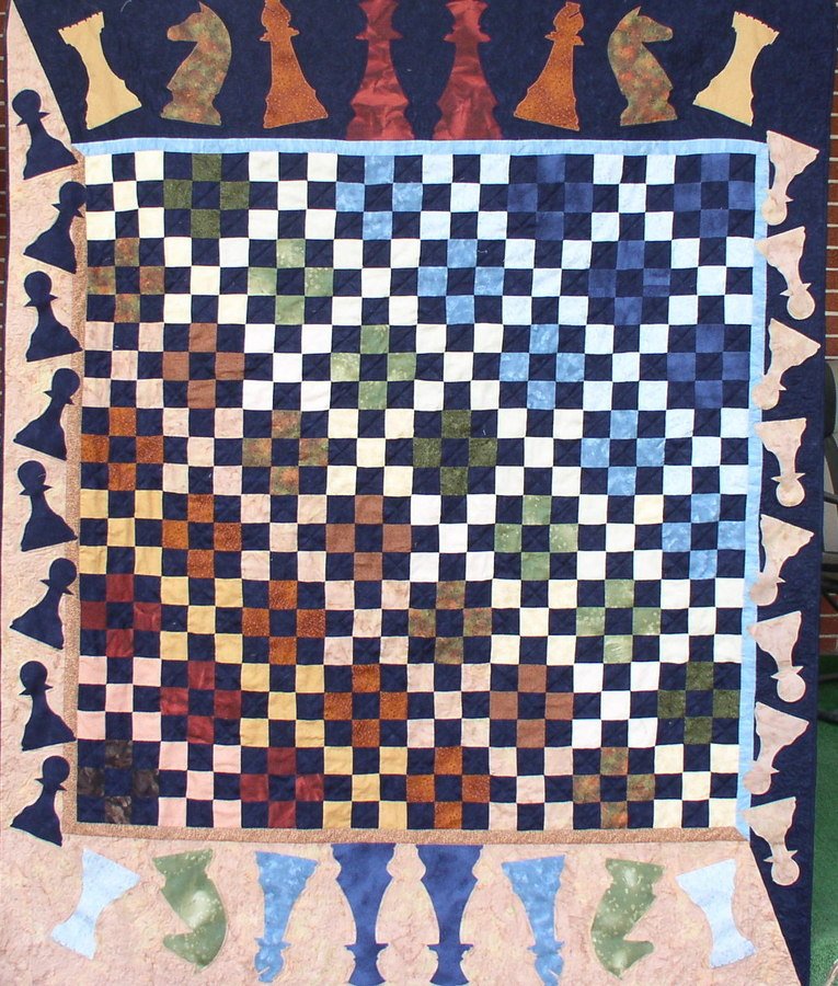 Chris525 Chess, Anyone? - Chess, Anyone? was commissioned as a suprise Christmas for Valerie's husband. He is an avid chess player, so I was very careful that the board squares were in the correct position as well as the pieces. Valerie reports that he was surprised and pleased.