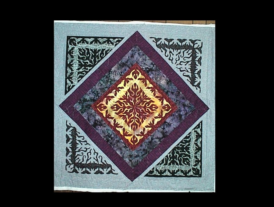 sherrysews200 Devils choice - I just Knew I had to applique this distinctive block, but it took me 4 years to find the right materials. Originally, there were to be nine blocks of the same pattern, and I had appliqued 8 of the nine when this setting sneaked into my head and I had to do it. It was very hard to cut those completed blocks in half, but it was worth it! This picture shows the whole thing before quilting, which I did on my home machine - I digitised a pattern from the elements of the design and quilted with my embroidery machine. I think it is perfect!