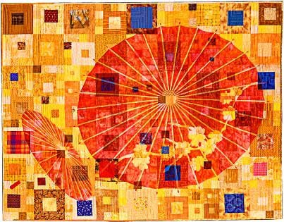 melodycrust Xishaungbanna - Southern China, the brightly dressed women, and happy people all impressions of a visit to this region of China called Xishaungbanna. Machine pieced and quilted using commercial cottons. The sheerness of the umbrellas is achieved with oil paint.