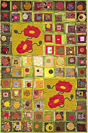 melodycrust Chatty Blossoms - It is important to me that my art quilts suggest a meaning to the viewer rather than simply decorate walls. Underlying much of my work is the theme of wonderment for the workings of the earth. This quilt is composed of commercial cottons and decorative threads. The work is hand appliqued and embroidered, machine pieced, couched, and quilted.