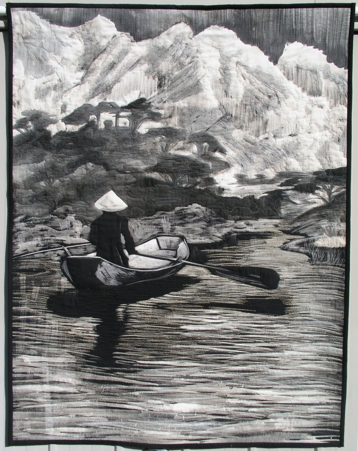 HelenGodden Mekong Gold - Bleach painted on black cotton to create the image. Free- Motion machine quilted with lots of gold across the water. Awarded Master of Innovative Artistry at IQA Houston 2006