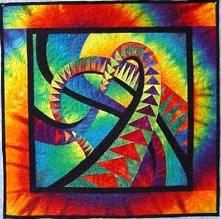 Joy76044 Soaring Compliments - Quilt is made from one of my hand dyed 24 Step Color Wheel Fabric and a Swirl Panel. The pattern, Soaring Compliments, is by Caryl Bryer Fallert. Caryl's patterns are great to utilize with my hand dyed fabric. Quilt was quilted on a long arm machine by Kathy Olson, Treasured Threads, Granbury, TX.